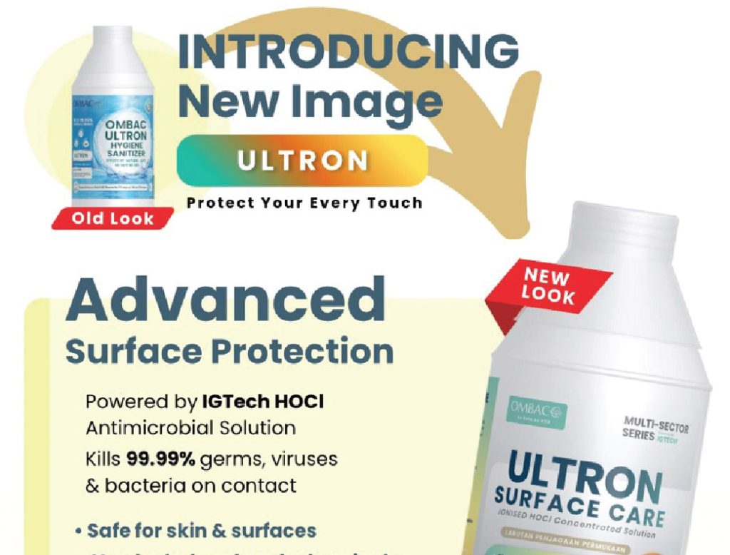 Ombac+ Ultron: Redefining Surface Protection with a New Look and Advanced HOCl Technology In today’s environment, where infectious diseases continue to evolve and spread across communities, the importance of effective surface hygiene has never been more critical. From healthcare facilities to homes and public spaces, environmental surfaces serve as key transmission points for pathogens, making reliable disinfection an essential part of daily protection. At Ionic Global Sdn Bhd, we are proud to introduce the refreshed Ombac+ Ultron—now presented in a new, modern packaging that reflects not only a renewed visual identity, but also our continued commitment to innovation, safety, and performance in antimicrobial solutions. Powered by IGTECH HOCl: Science-Driven Protection At the core of Ombac+ Ultron lies stabilised high-purity hypochlorous acid (HOCl), developed through proprietary IGTECH technology. HOCl is a naturally occurring molecule produced by the human immune system, widely recognised for its powerful antimicrobial action against bacteria, viruses, and fungi. Scientific and clinical evidence has consistently demonstrated that HOCl is one of the most effective and safest disinfectants available today. It offers broad-spectrum antimicrobial activity and has been shown to effectively inactivate a wide range of pathogens, including emerging infectious agents such as SARS-CoV-2 . Its mechanism of action targets multiple sites within microorganisms, reducing the likelihood of resistance while ensuring rapid microbial inactivation . Responding to a Changing Disease Landscape In recent years, global awareness of infectious diseases has significantly increased, driven by pandemics, antimicrobial resistance (AMR), and the rising incidence of hospital- and community-acquired infections. Environmental surfaces have been identified as critical vectors in the transmission chain, particularly in high-contact areas such as clinics, workplaces, and public facilities. This evolving landscape calls for disinfectants that are not only effective, but also safe for frequent and widespread use. Traditional disinfectants, while potent, may carry limitations such as toxicity, skin irritation, or environmental concerns. In contrast, HOCl-based solutions offer a balanced approach—combining high antimicrobial efficacy with excellent safety and biocompatibility. Ombac+ Ultron: Powerful Yet Gentle Ombac+ Ultron is designed to meet the demands of modern hygiene practices through a formulation that is both strong against pathogens and safe for everyday use. • 99.99% antimicrobial performance• Alcohol-free and non-toxic, suitable for frequent application• Gentle on skin and surfaces, reducing irritation risks• No harmful residue, supporting safe continuous use• Versatile application across homes, clinics, industries, and public environments By leveraging IGTECH, Ombac+ Ultron ensures a stable and high-purity HOCl formulation, delivering consistent and reliable performance even in demanding environments. This makes it particularly suitable for routine disinfection in settings where both safety and efficacy are paramount. Bridging Safety and Effectiveness in Everyday Hygiene The role of surface disinfection is no longer confined to healthcare settings—it is now an integral part of everyday life. Whether in homes, offices, clinics, or shared public spaces, maintaining clean and hygienic environments contributes significantly to reducing infection risks and protecting overall well-being. Ombac+ Ultron is developed with this reality in mind—providing a solution that empowers users to maintain high hygiene standards without compromising safety. Its gentle yet effective formulation supports frequent use, making it an ideal choice for both professional and personal environments. A New Look, A Continued Commitment The new packaging of Ombac+ Ultron represents more than a visual refresh—it reflects Ionic Global’s forward-looking approach in delivering solutions that are scientifically grounded, user-friendly, and aligned with modern healthcare needs. As part of our broader mission, Ionic Global remains committed to advancing antimicrobial technologies that support safer environments, reduce infection risks, and contribute to improved public health outcomes. In a world where hygiene is no longer optional but essential, Ombac+ Ultron stands as a reliable partner in daily protection. Powered by IGTECH HOCl, it embodies the balance between science and safety, strength and gentleness—delivering effective surface disinfection for today’s evolving needs.